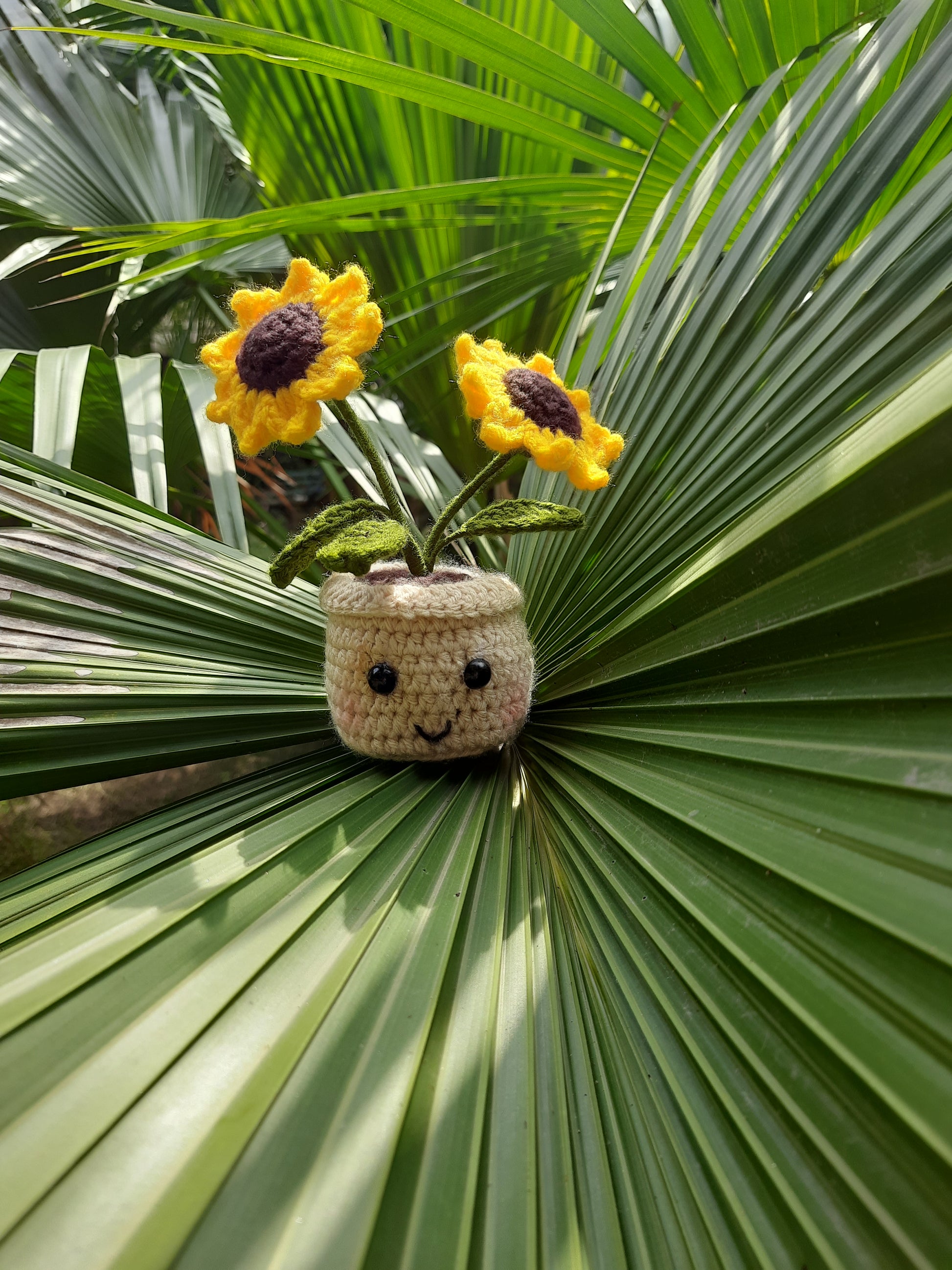 - It comes with a hand crocheted pot, two sunflowers with leaves.