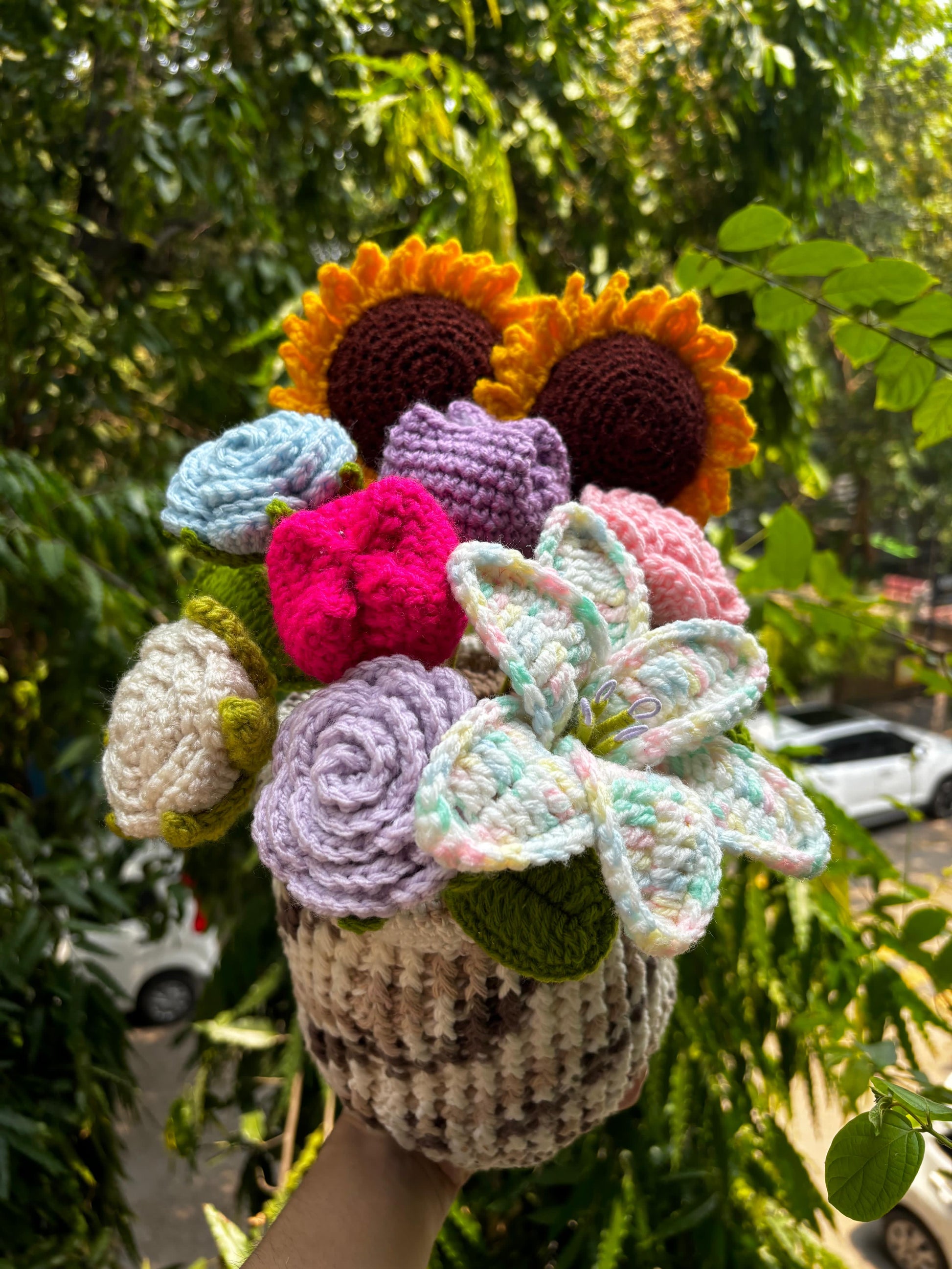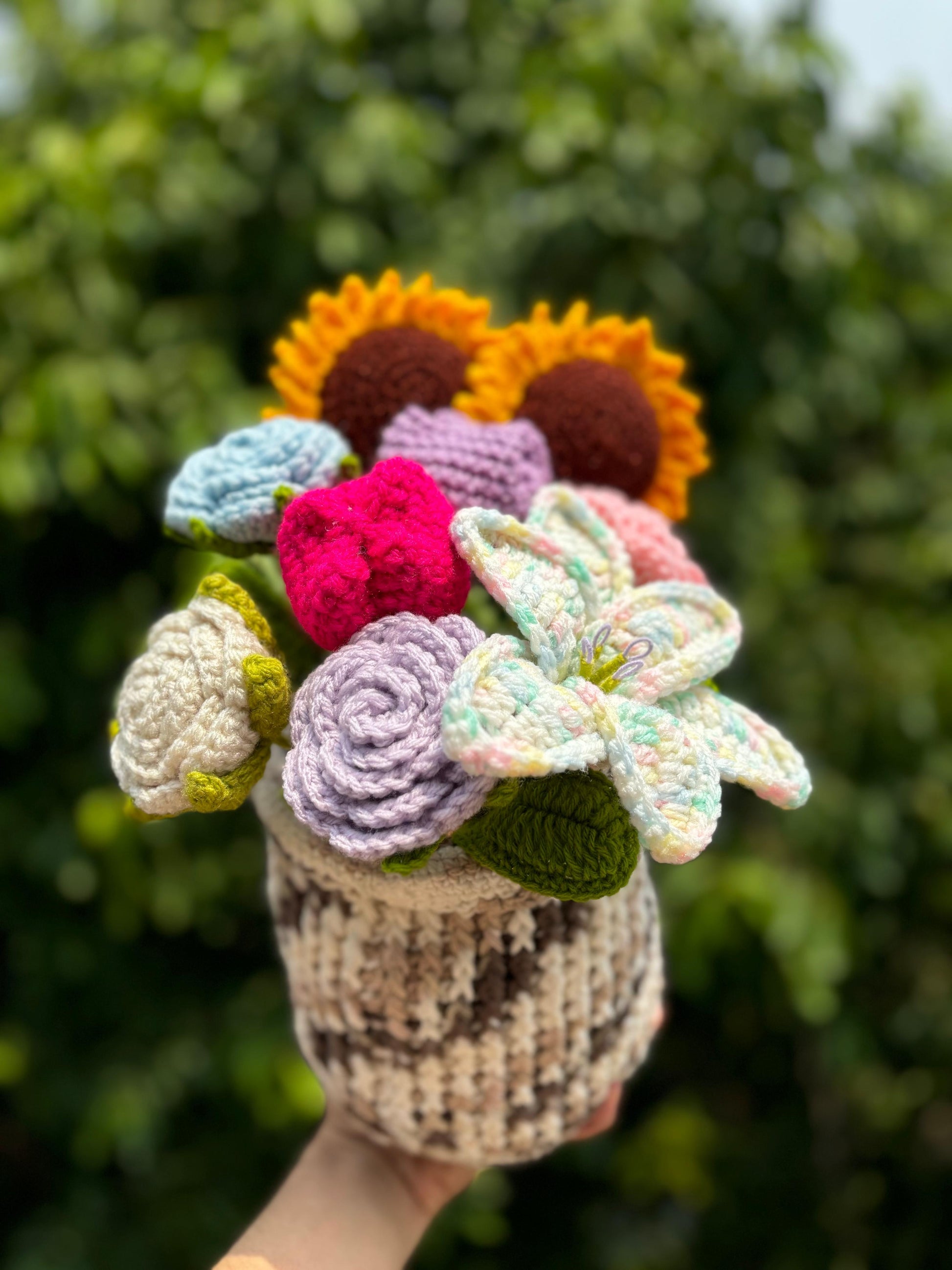 Who needs a green thumb when you’ve got yarn magic? Say hello to your Bloom Buddy Pot, a delightful little garden made from colorful crochet, packed with charming handcrafted flowers that never fade, droop, or ask for sunlight.