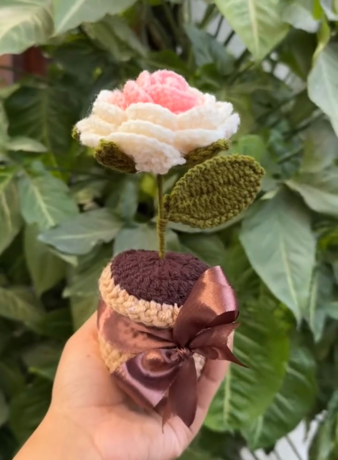 - It comes with a hand crocheted pot, a rose and two leaves.